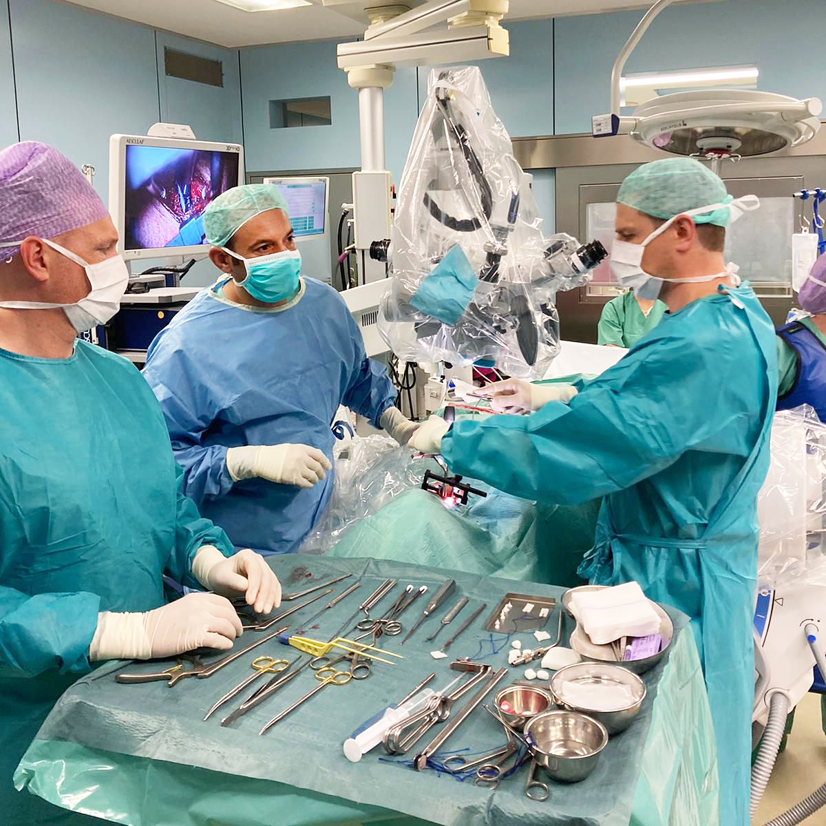 Jetzt reiste sogar der renom­mierte Wirbel­säu­len­chirurg Dr. Alexander Montgomery aus London extra nach Kassel, um Dr. Wojtas bei drei Opera­tionen begleiten zu dürfen. Unter der Leitung des Kasseler Neuro­chir­urgen wurden drei Patienten mit hochmo­dernen Implan­taten versorgt. Dr. Wojtas resümierte: „Es war ein wunder­barer und inten­siver Fachaus­tausch. Wir beide haben von dem Tag sehr profi­tiert und vonein­ander gelernt. Dies gewon­nenen Erkennt­nisse können wir unmit­telbar an unsere Patien­tinnen und Patienten weiter­geben.“