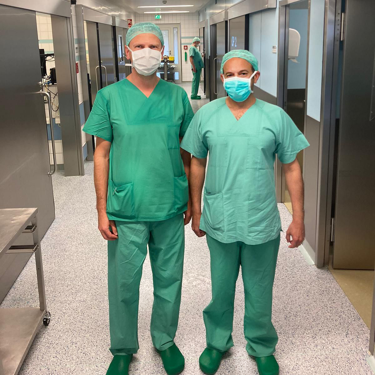 Foto im Flur nach der OP: Dr. med. Kordian Wojtas vom Wirbel­säu­len­zentrum Kassel und Wirbel­säu­len­chirurg Dr. Alexander Montgomery aus London (von links).